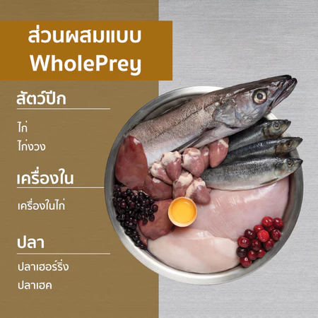 ไก่, ไก่งวง, ปลาเฮอริ่งทั้งตัว, เครื่องในไก่งวง (ตับ, หัวใจ, กระเพาะ) ปลาแซลมอน, ไก่แห้ง, ไก่งวงแห้ง, ปลาแซลมอนแห้ง, ตับไก่แห้ง, ไข่แห้ง, ถั่วเลนทิลแดงทั้งเมล็ด, ถั่วพินโตทั้งเมล็ด, ถั่วเลนทิลเขียวทั้งเมล็ด, ตับไก่, ไข่, ไขมันไก่, รสไก่ธรรมชาติ, ถั่วเนวี่ทั้งเมล็ด, ถั่วชิกพีทั้งเมล็ด, ถั่วลันเตาทั้งเมล็ด, น้ำมันปลาพอลล็อค, เส้นใยจากถั่วเลนทิล, หัวใจไก่, โคลีนคลอไรด์, แครนเบอร์รี่ทั้งลูก, สาหร่ายทะเลแห้ง, โทโคฟีรอลผสม (สารกันบูด), อาหารเสริมวิตามินอี, ซิงค์โปรตีเนต, ฟักทองทั้งลูก, บัตเตอร์นัทสควอชทั้งลูก, คะน้า, แอปเปิลทั้งลูก, ลูกแพร์ทั้งลูก, ไทอามีนโมโนไนเตรต, คอปเปอร์โปรตีเนต, ไนอาซิน, ไพริดอกซีนไฮโดรคลอไรด์, ผลิตภัณฑ์หมักบาซิลลัสโคกูแลนแห้ง, รากชิโครีแห้ง, ขมิ้น, รากซาร์ซาพาริลลา, รากอัลเทีย, โรสฮิป, ผลจูนิเปอร์, กรดซิตริก (สารกันบูด),สารสกัดโรสแมรี่.