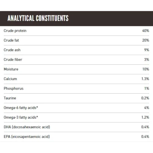 - ส่วนผสม เนื้อไก่ เนื้อไก่งวง ไข่ ตับไก่ ปลาฟลาวเดอร์ ปลาแฮร์ริ่ง ตับไก่งวง หัวใจไก่ หัวใจไก่งวง คอไก่ ไก่อบแห้ง ไก่งวงอบแห้ง ปลาแมกคอเรลอบแห้ง ปลาซาร์ดีนอบแห้ง ปลาแฮร์ริ่งอบแห้ง ไขมันไก่ ถ้วเลนทิลแดง ถั่วลันเตา ถั่วแลนทิลเขียว ถั่วชิกพี ถั่วแลนทิล เหลือง ไฟเบอร์ ถั่วเลนทิล ถั่วพินโต ถั่วเนวี กระดูกอ่อนไก่ น้ำมันปลาแฮร์ริ่ง ตับไก่ ฟักทอง แครอุท เรดดิลิเชียส บาร์ตเลตแพร์ ผักเคล ผักโขม บีทกรีน เทอร์นิปกรีน สาหร่ายสีน้ำตาล แครน เบอร์รี บลูเบอร์รี่ สาส์กาตูนเบอร์รี่ รากชิโครี ขมิ้น มิลค์ทิสเซิล รากโกโบ ลาเวนเดอร์ ราก มาร์ชแมลโลว โรสฮิป สารถนอมคุณภาพอาหารสัตว์ วิตามินอี คอปเปอร์คีเลต โคลีนคลอไรต์ พีเซียม วิตามิน